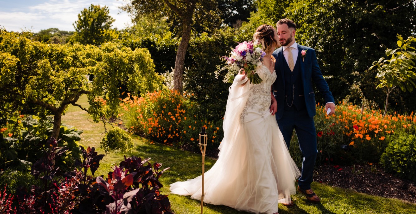 Two women celebrating at their LGBTQI+ wedding in the North East of England. They are both holding flowers and hands, walking through their guests laughing while everybody throws confetti. Image Source: iStock Photos